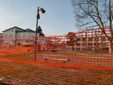 Il cancelletto d'ingresso è chiuso con fil di ferro e da un divisorio arancione da cantiere che è stato posto tutto attorno al parco dove non c'è la recinzione, sia verso le sponde del lago che verso il lido.