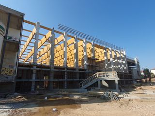 La struttura originaria del mai completato palaghiaccio è stata integrata con quella nuova. I vecchi pilastri sono stati “allungati” (poiché l’impianto per la ginnastica prevede altezze diverse) e sono ora alternati con quelli nuovi.