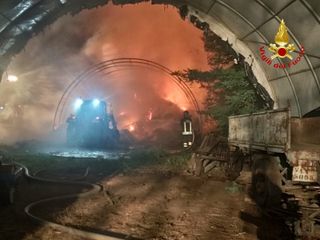 FOTO. Fagnano, incendio in un deposito di fieno: i vigili del fuoco intervengono con sette mezzi da tutta la provincia