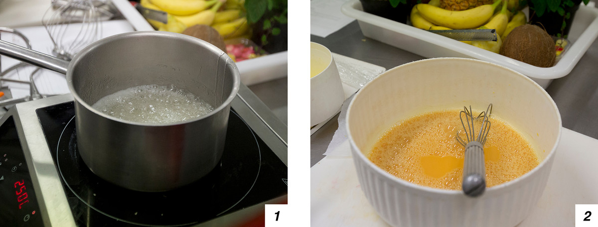 Iniziamo preparando lo sciroppo: il rapporto è di 0,675 litri di sciroppo con mezzo litro d’acqua. Lo portiamo a ebollizione e lo facciamo andare due minuti (1), poi lo lasciamo raffreddare. Ne prenderemo 110 grammi: il resto si può mettere in frigo e dura anche un mese. Ora prendiamo il tuorlo d’uovo (2) e lo versiamo nella planetaria unendolo allo sciroppo (3), poi li facciamo montare: il prodotto deve diventare spumoso. Facciamo intanto sciogliere la gelatina in acqua fredda per poi unirla al composto. La gelatina potete sceglierla in fogli o in polvere: in basso vi spieghiamo come lavorare l’una e l’altra (*).