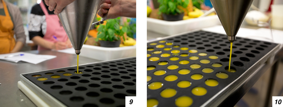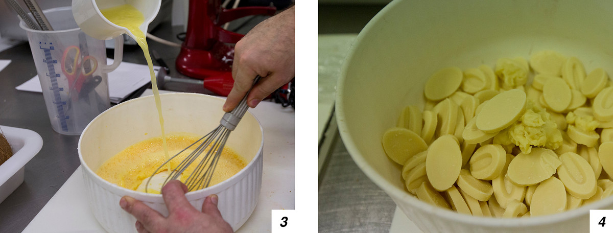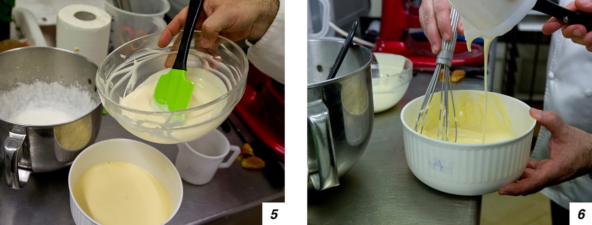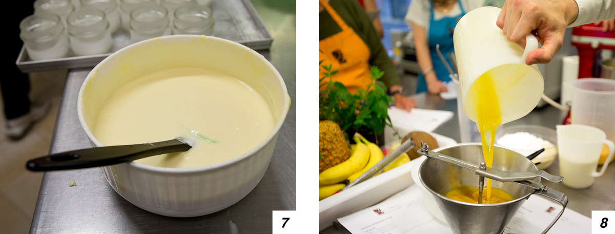 Il cioccolato bianco va fatto sciogliere e aggiunto a 45° (5). Per ultima prendiamo la panna fresca, che va appena appena montata: deve rimanere quasi liquida. Uniamo il tutto (6-7) e passiamo all’inserto di passion fruit (8).