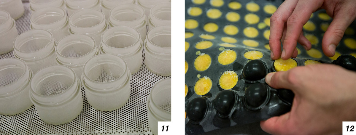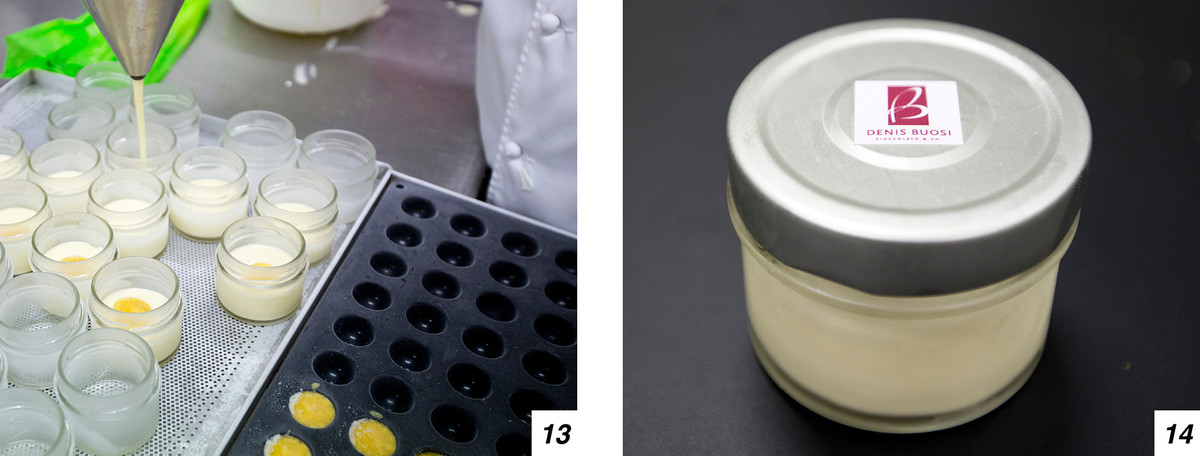 Siamo in dirittura d’arrivo: prendiamo dei vasetti (11), togliamo uno ad uno gli inserti di passion fruit dagli stampini (12) e mettiamoceli dentro.
