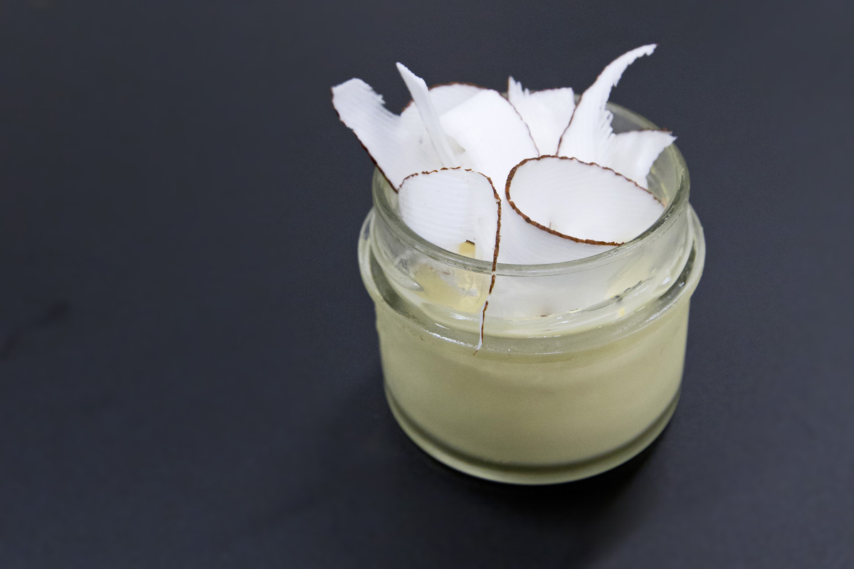 Ci siamo! Ora coliamo la mousse al cioccolato bianco (13) e se vogliamo tenerne via qualcuno chiudiamo i barattoli (14). Quando è il momento di mangiare il nostro dolce, possiamo guarnire con ciò che preferiamo: noi abbiamo scelto delle scaglie di cocco.