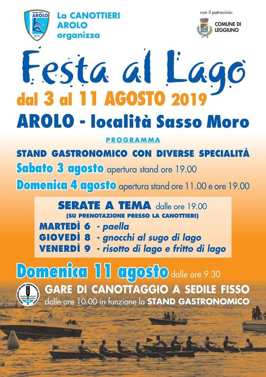 La società sportiva canottieri Arolo organizza la tradizionale "festa al lago" nella sua sede in località Sasso Moro. Il programma prevede sabato 3 agosto e domenica 4 agosto apertura stand gastronomico (il sabato dalle 19 alle 22, la domenica dalle 11 alle 14 e dalle 19 alle 22), con diverse specialità lacustri. Da martedì 6 agosto serata di specialità su prenotazione: dalle ore 19 verrà cucinata la paella. Giovedì 8 agosto specialità locale con gnocchi al sugo di lago. Venerdì 9 agosto risotto del lago Maggiore con fritto misto del lago cucinato secondo una antica ricetta arolese. Domenica 11 agosto sarà in funzione lo stand gastronomico mentre si svolgeranno le gare di canottaggio a sedile fisso.