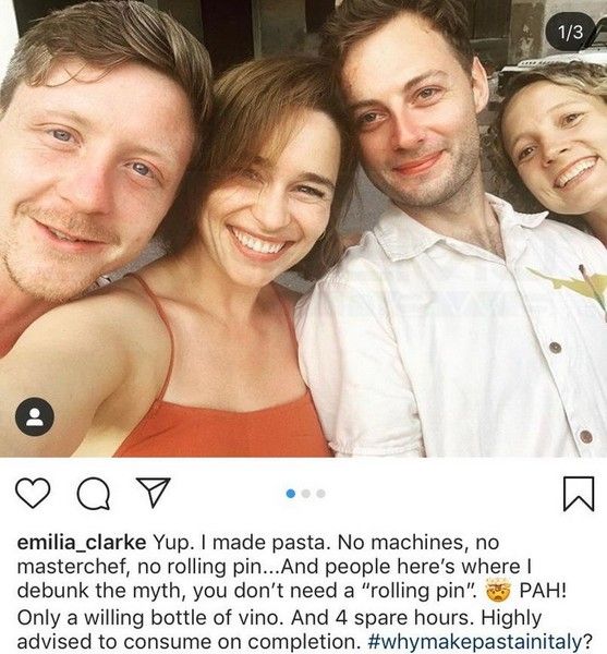 Emilia Clarke, la "madre dei draghi", si è dilettata a fare la pasta a mano come ha scritto lei stessa nel suo profilo Instagram: «Si ho fatto la pasta: niente macchine niente Masterchef, solo una bottiglia di vino». Poi una bella giornata sui massi attigui al Rio Carne, dove non è mancato ovviamente un tuffo per sfuggire alla calura.