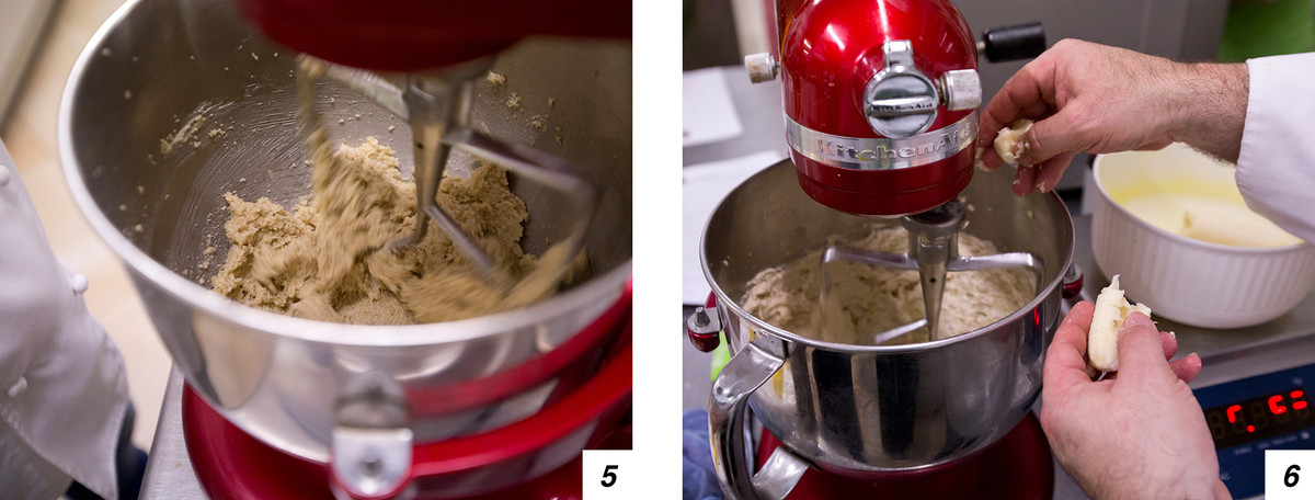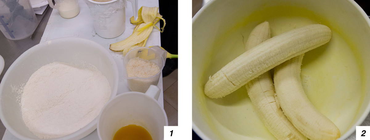 Cominciamo prendendo burro morbido, zucchero di canna, polvere di cocco e banane (1-2); la polvere di cocco, se si vuole, è possibile tostarla un pochino: basta metterla sul piatto crisp del microonde per un minuto. Ora uniamo la polvere di cocco al burro e allo zucchero e li mettiamo nella planetaria munita di foglia per amalgamarli (3), poi aggiungeremo a filo gli altri ingredienti (4). Prima però, mentre l’impasto inizia a girare (5), aggiungiamo le banane spezzate e schiacciate (6). Se volete usare un frutto diverso, anche il mango e la papaya stanno bene.