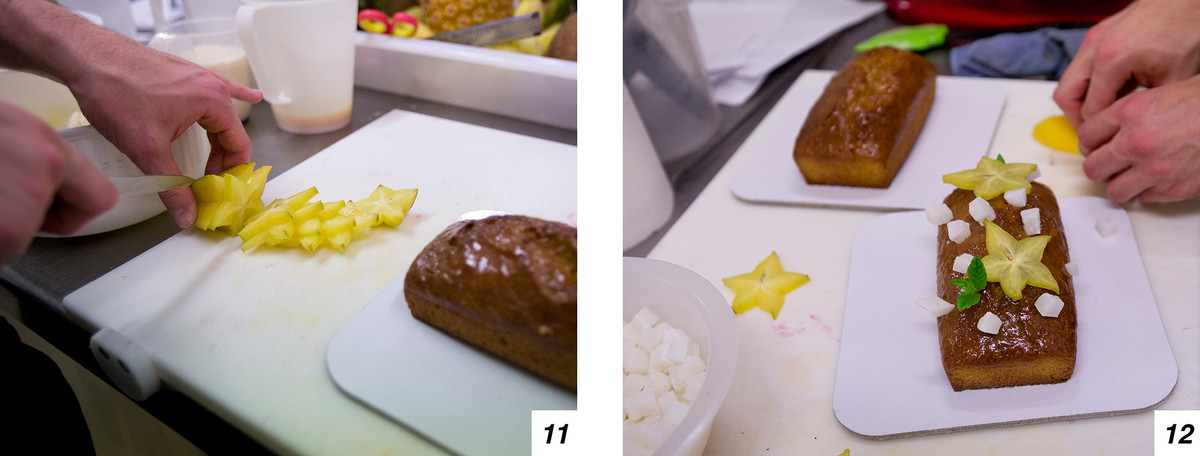 Il dolce va bagnato bene, in modo da restare morbido. Alla fine potete guarnire come preferite: noi abbiamo usato star fruit, cocco, mango e menta (11-12).