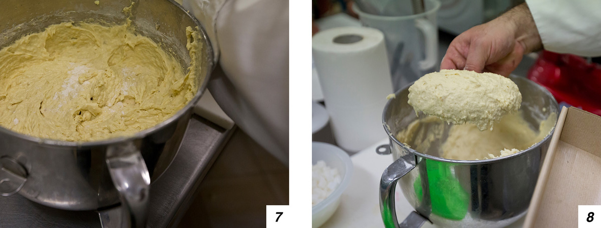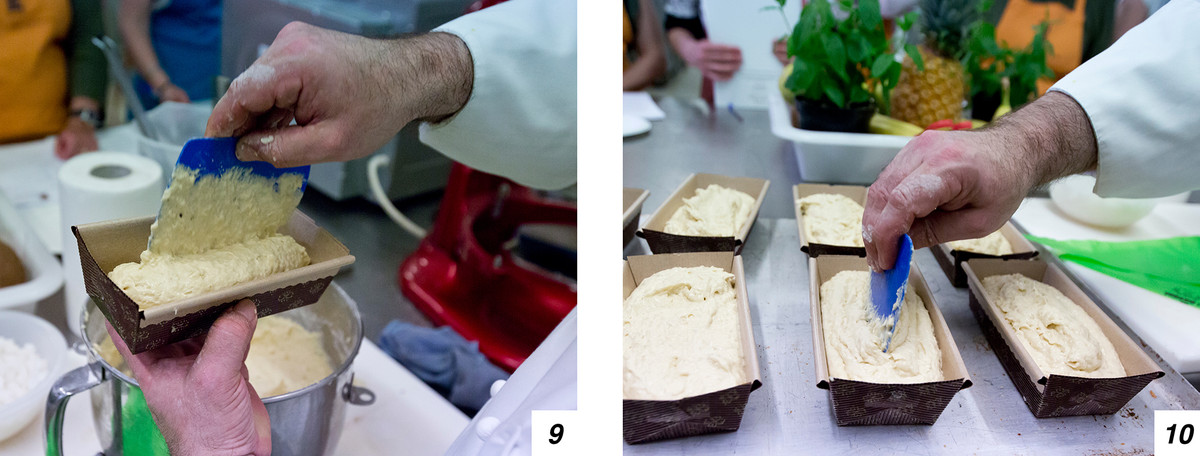 Preparato l’impasto (7) bisogna coprirlo e farlo riposare in frigo per una notte. Il giorno dopo riprendiamo l’impasto e lo stendiamo. Ora prendiamo lo stampo (il nostro è di circa 400 grammi) e ci versiamo l’impasto (8-9-10), dopodiché mettiamo in forno a 150 gradi, statico, per 50 minuti.