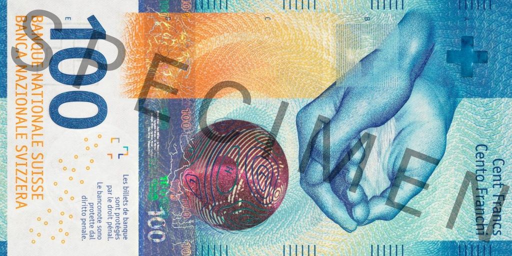 Ognuno dei sei biglietti (10 – 20 – 50 – 100 – 200 – 1000) presenta un aspetto tipico della Svizzera. La banconota da 100 franchi mostra la tradizione umanitaria della Svizzera, rappresentata graficamente mediante l’acqua. Analogamente agli altri tagli della nuova serie, anche su questo biglietto la mano e il globo figurano fra i motivi marcanti.