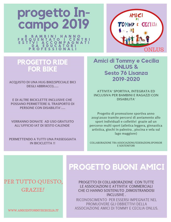 Per primo il progetto “Buoni Amici”, importante progetto di collaborazione con tutte le associazioni e attività commerciali che hanno sostenuto l'iniziativa e si sono dimostrate inclusive: tra le tante, Kris Vik Barbers che ha organizzato un evento benefico, le associazioni Circolo Sestese e Mago libero con cui l'associazione sestese ha collaborato per la realizzazione del campus estivo inclusivo, negozi e bar che hanno ospitato le raccolte fondi. Ma anche i Frutti Digitali, agenzia di social media, che ha realizzato per il sodalizio, gratuitamente, il sito internet, permettendo agli "Amici di Tommy e Cecilia" di essere online sulla pagina www.amiciditommyececilia.it. Un sito nel quale si possono trovare tutte le informazioni sulla associazione e leggere i racconti del blog.