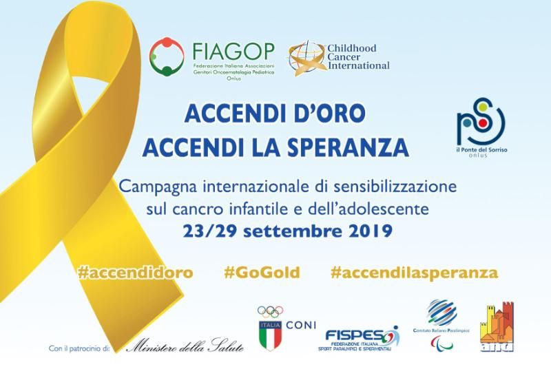 Da lunedì 23 a domenica 29 settembre la rete di associazioni di "Fiagop", della quale fa parte anche Il Ponte del Sorriso darà vita sul territorio nazionale alla seconda edizione della campagna di sensibilizzazione pubblica "Accendi d’Oro, Accendi la Speranza’"a sostegno dei bambini e degli adolescenti che hanno contratto tumori e leucemie. L’iniziativa si colloca nell’ambito del Settembre d’Oro mondiale dell’oncologia pediatrica a cura di ‘Childhood Cancer International’, un network di associazioni di genitori presente nei 5 continenti, attive sia dentro che fuori dai centri di cura.