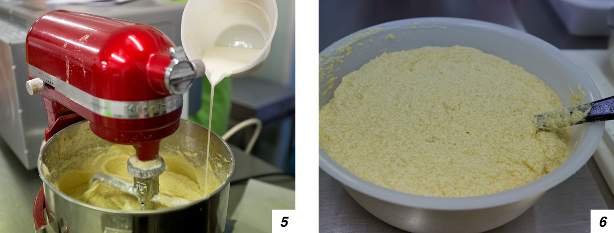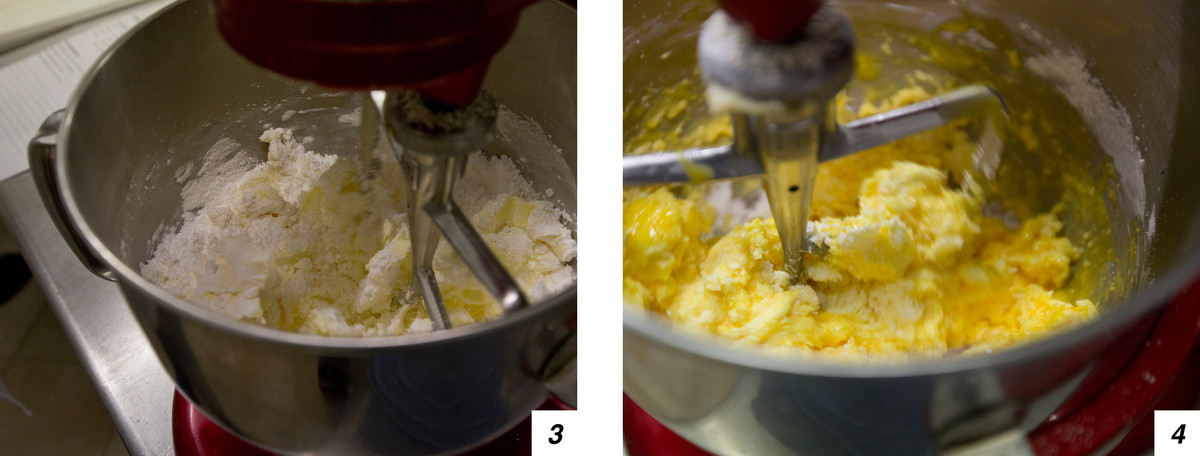 Partiamo dalla preparazione della base della crostata. In una planetaria munita di foglia facciamo girare burro morbido e zucchero a velo (foto 1). Poi versiamo a filo le uova e la farina di mandorle (5-2), dopodiché aggiungiamo in 3 volte la farina 0 (3-4).