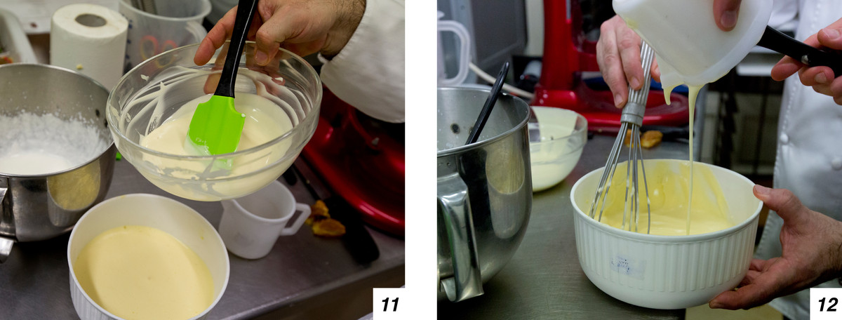Ora prepariamo la crema al limone e cioccolato bianco (9-10). Per prima cosa misceliamo uova e zucchero (11-12), nel frattempo facciamo andare sul fuoco il succo di limone, che deve bollire. Terminata l’operazione, aggiungiamo il succo di limone caldo a filo sulle uova e lo zucchero in modo da creare una crema pasticcera, che facciamo addensare sul fuoco.
