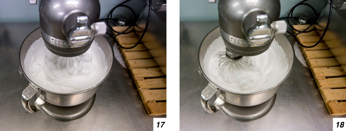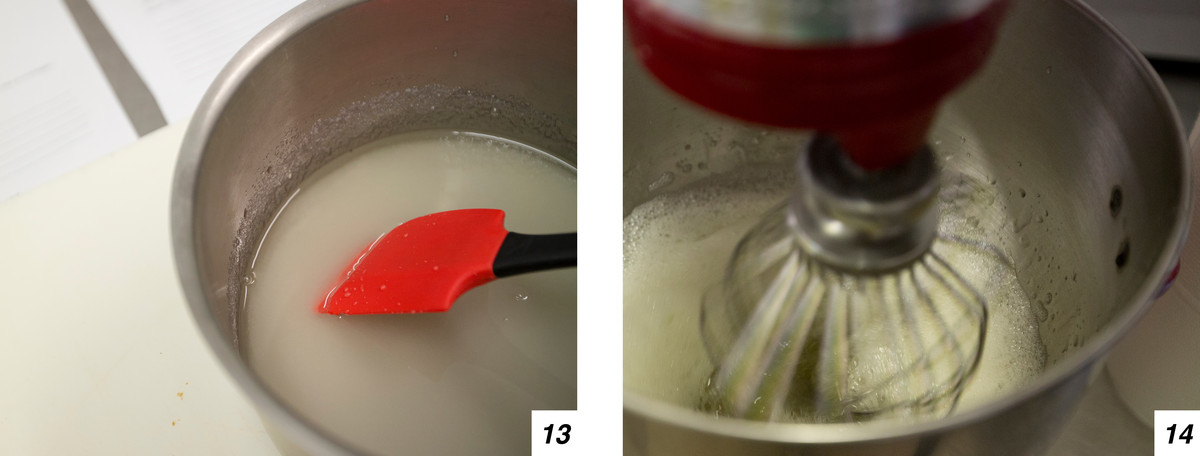 Per prima cosa mettiamo acqua e 470 grammi di zucchero semolato nel pentolino: per questa operazione serve il termometro, poiché il composto deve raggiungere esattamente i 121 gradi. Nel frattempo mettiamo l’albume d’uovo e 120 gr zucchero nella planetaria con la frusta (13-14-15-16).