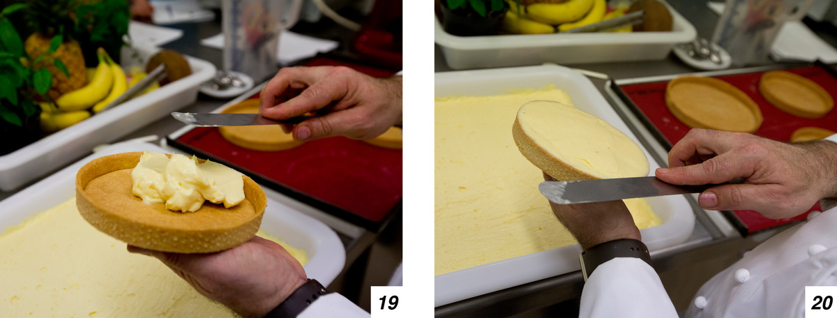 Togliamo dallo stampo la base cotta, la riempiamo con la crema e la livelliamo con l’aiuto di una spatola (19-20).