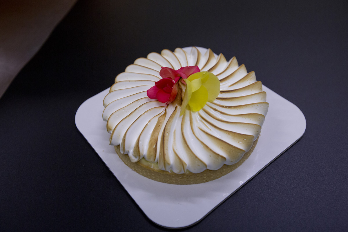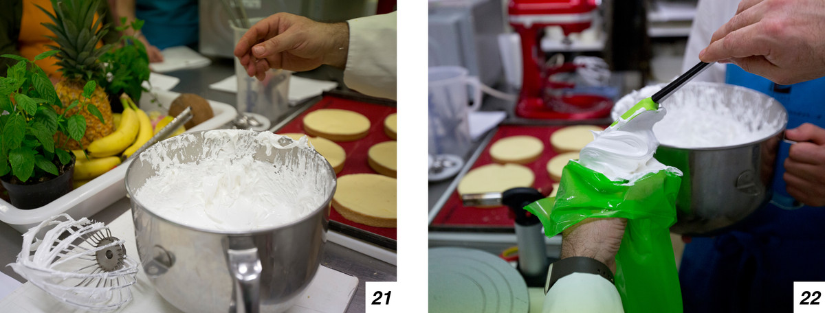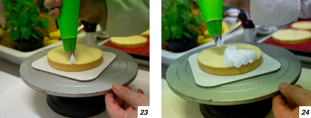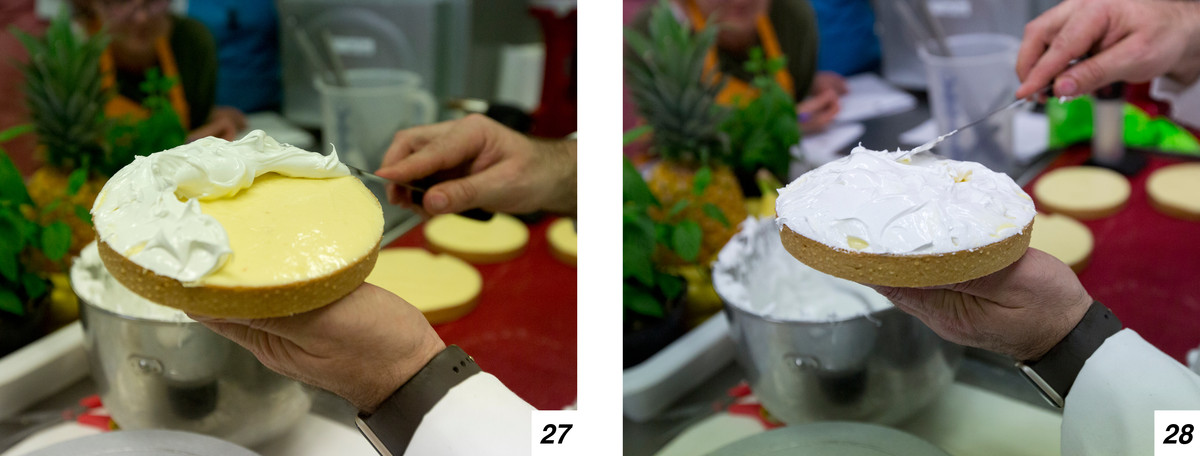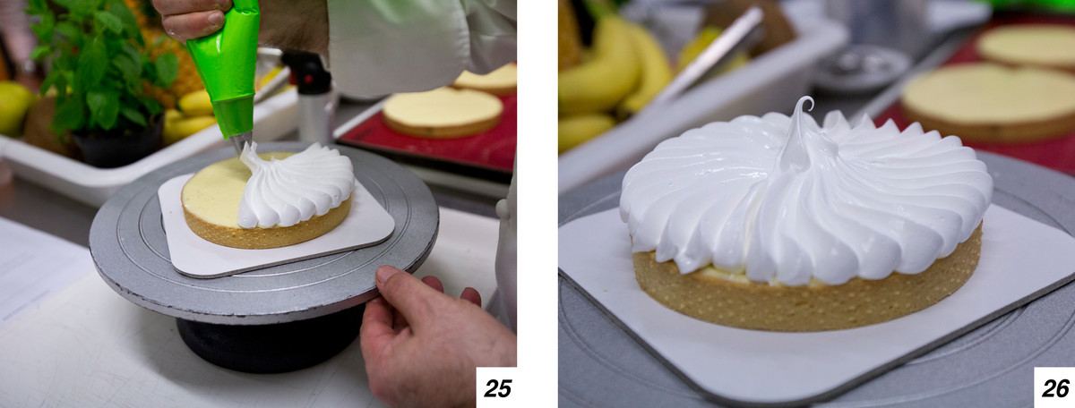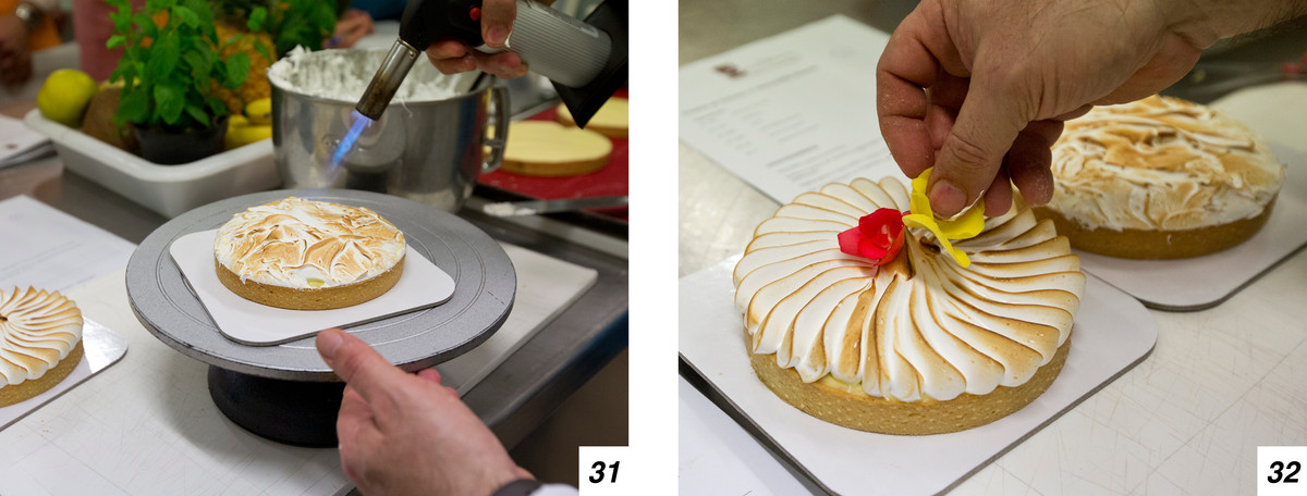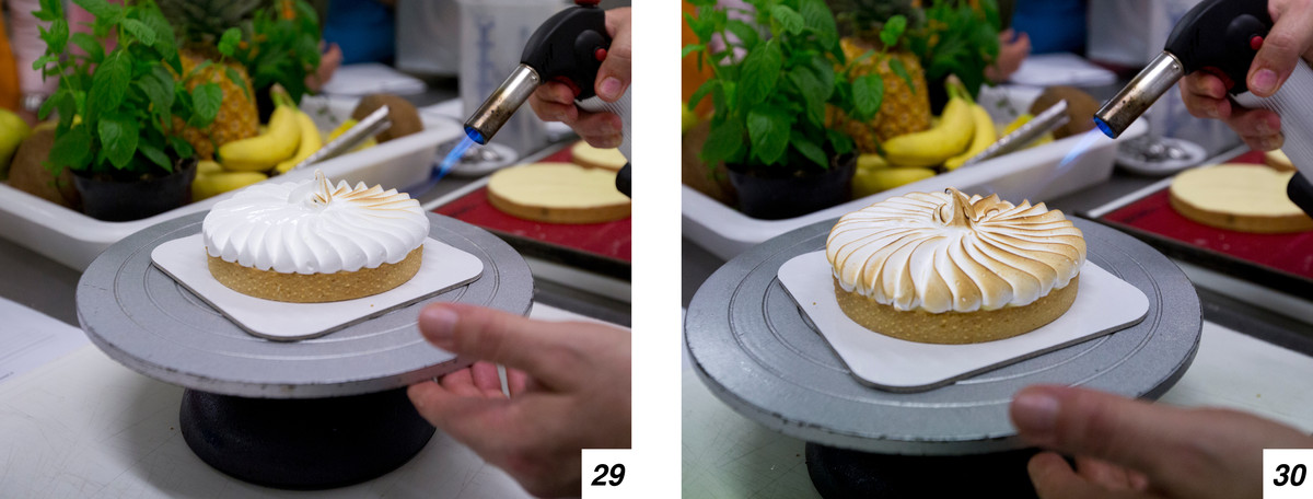 L’ultimo passo sarà quello di flambare la meringa (29-30) girando piano piano la torta usando un piatto rotante, e infine guarnire (31-32).