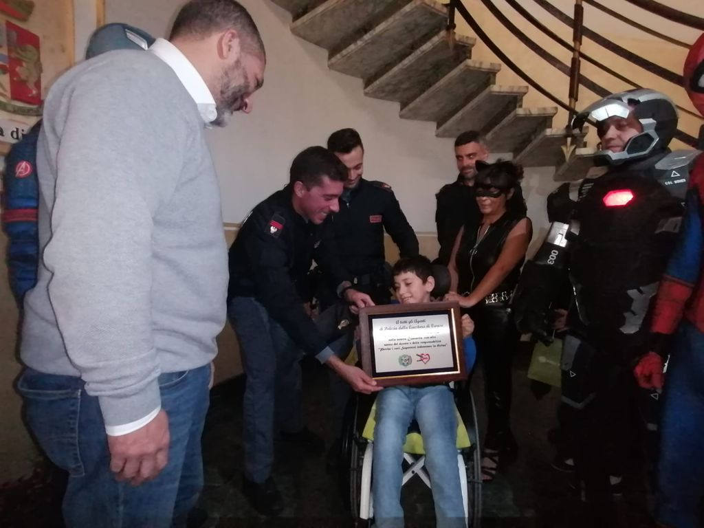 A consegnare nelle mani del questore vicario la targa è stato il piccolo Luca, che tutti ormai conoscono in città per l’impegno che, insieme a mamma Emanuela Solimeno, sta mettendo per realizzare un’area giochi inclusiva, il Parco Gioia, a Villa Mylius. Accompagnato in sala operativa, Luca ha anche potuto mandare un messaggio di incoraggiamento a tutti gli agenti in servizio sul territorio.