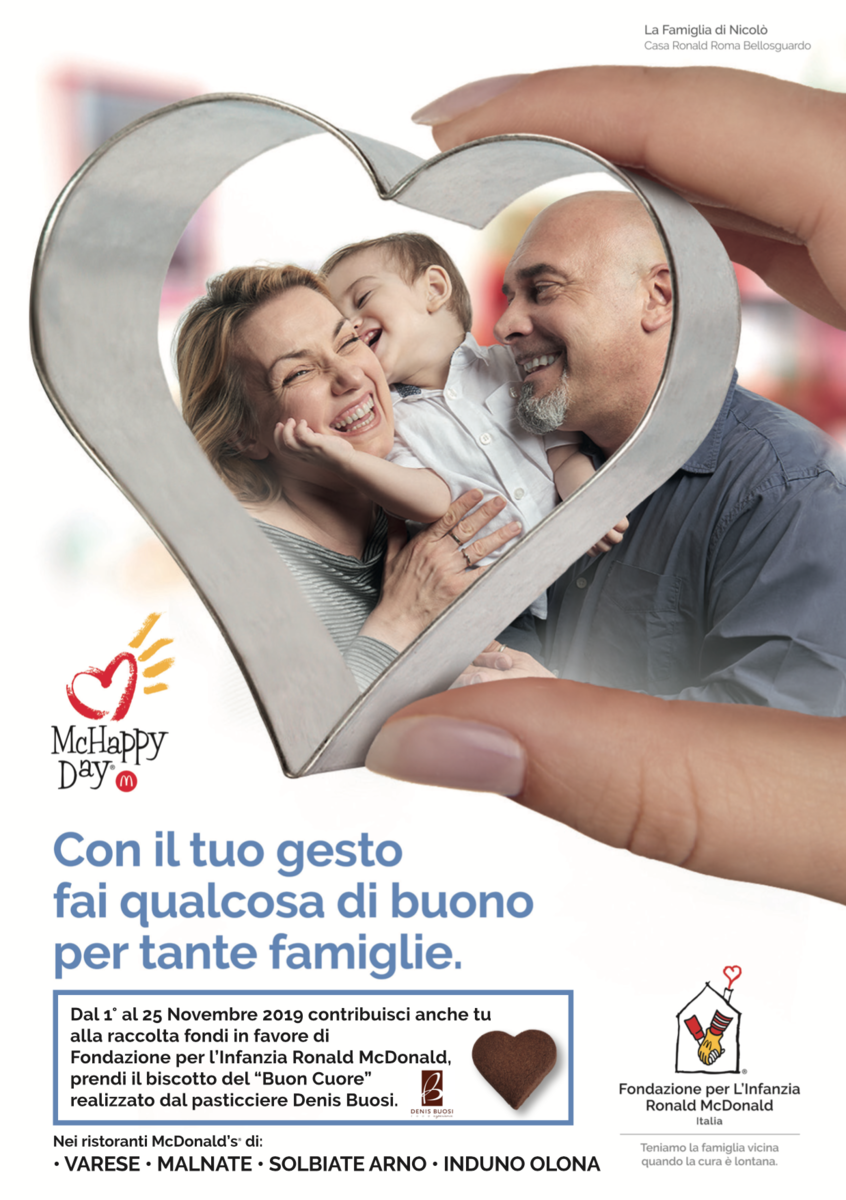 Non faranno ovviamente eccezione i McDonald’s del nostro territorio. E nei cinque della “cintura varesina” - Varese centro, Varese stadio, Malnate, Solbiate Arno, Induno Olona - ci sarà anche una golosa sorpresa: la Pasticceria Buosi ha infatti creato nel suo laboratorio un biscotto speciale, il “biscotto del buon cuore”, che verrà donato a chi vorrà contribuire a questa nobile causa.