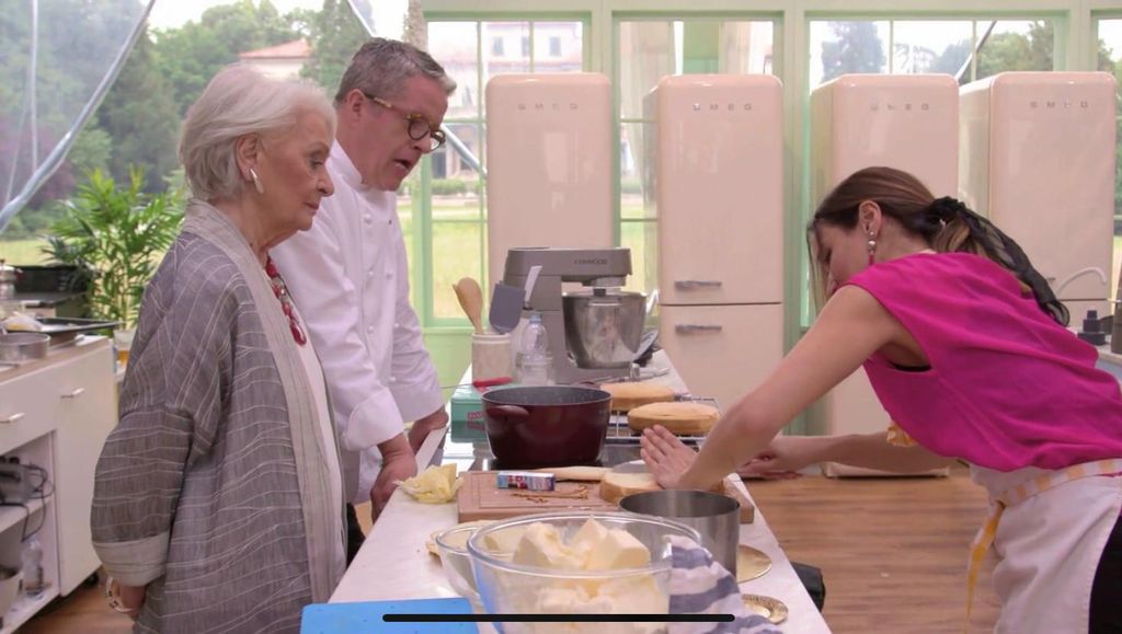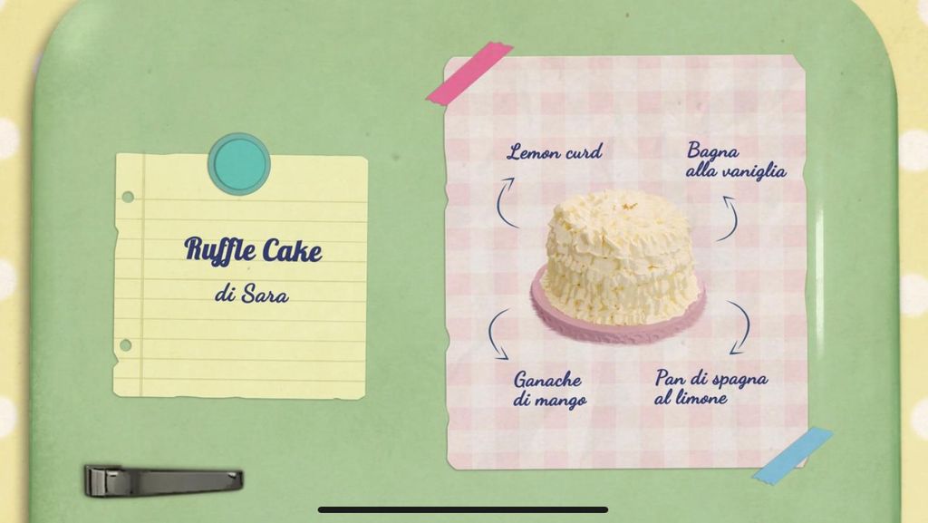 Pronti, via e si parte con la prova creativa: i concorrenti dovranno realizzare una ruffle cake, una torta arricciata in basso e liscia in cima dal grande effetto scenografico. La nostra Sara ha un piccolo incidente, che affronta con la solita tranquillità: «Mi è caduta una delle basi… Fa niente, la mia torta verrà un po’ più piccola!». Knam e Clelia fanno visita a Nonna Papera, che svela di amare il cake design e anche di essersi spesso ispirata al maestro Ardovino. La sua ruffle cake è un pan di spagna al limone con bagna alla vaniglia, lemon curd e ganache di mango.