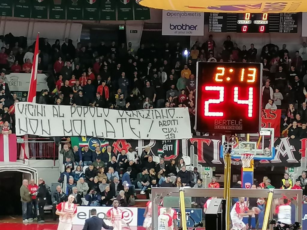 Guardiamo la partita al contrario e riviviamo subito il pazzesco overtime. Partendo però da tre striscioni esposti a inizio gara. I veneziani nel settore ospite appendono questa frase: «Assenti, stiamo lottando contro gli eventi». La risposta della curva biancorossa: «Vicini al popolo veneziano, non mollate». Poi, durante il primo quarto, un pensiero per i vigili del fuoco dopo i tragici fatti di Alessandria: striscione «Varese con dolore vi omaggia e vi rende onore», coro «il pompiere paura non ne ha» e un mazzo di fiori consegnato ai rappresentanti locali.