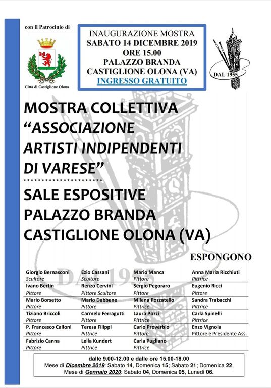 Sarà inaugurata il prossimo 14 dicembre 2019 alle ore 15.00 negli spazi espositivi del Museo Civico Branda Castiglioni (Via G. Mazzini, 23) a Castiglione Olona la mostra collettiva dell’Associazione Artisti Indipendenti di Varese, gruppo di pittori e scultori formatosi nel 1955.