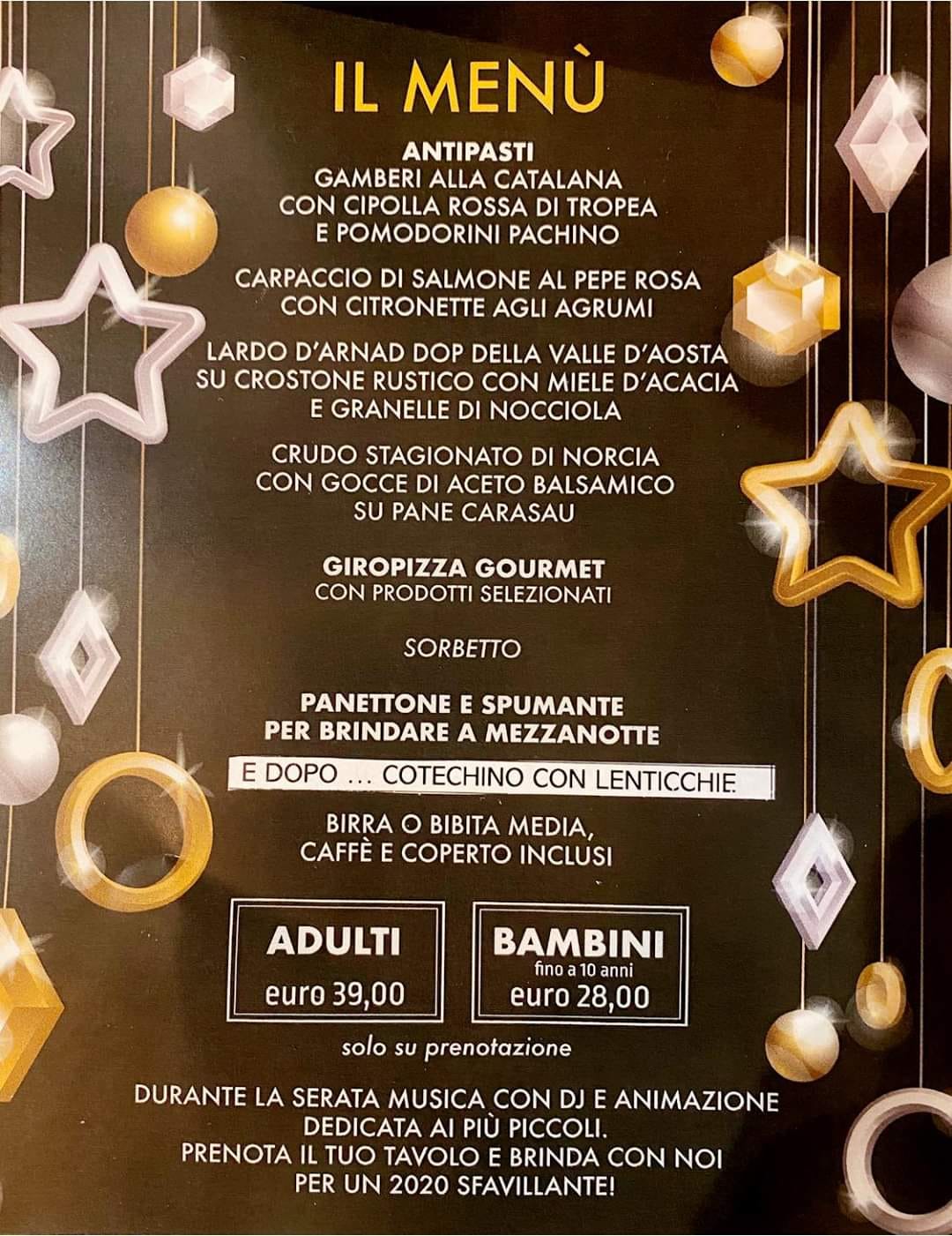 Il menù propone una selezione di antipasti (gamberi alla catalana con cipolla rossa di tropea e pomodorini pachino; carpaccio di salmone al pepe rosa con citronette agli agrumi; lardo d'arnad dop della Val d'Aosta su crostone rustico con miele d'acacia e granella di nocciola; crudo stagionato di norcia con gocce di aceto balsamico su pane carasau), poi l'immancabile giro-pizza e a seguire i grandi classici, il cotechino con le lenticchie e il panettone con lo spumante a mezzanotte.