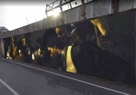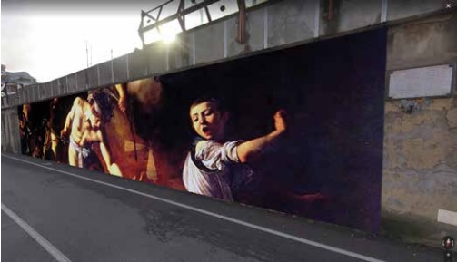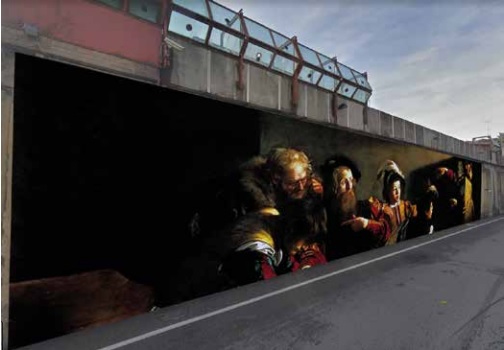 Si tratta di due particolari di due distinti capolavori del passato. La prima ipotesi riprende due dettagli della “Vocazione di S.Matteo” e del “Martirio di S.Matteo” entrambi del Caravaggio.