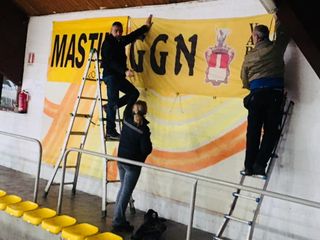 Bastava fare tappa questa sera al palaghiaccio per respirare l'aria dei bei tempi: i "ragazzini" Gigi e Vise dei Mastini Forever fanno le prove generali per l'affissione del nuovo striscione, bellissimo, che campeggerà sui distinti accanto alla curva Nord con i colori gialloneri e lo stemma di Varese in evidenza.