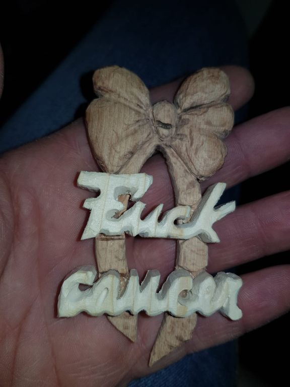 Un fiocco intagliato nel legno con la scritta "Fuck Cancer" realizzato interamente a mano dal calciatore ventiseienne di Daverio che, oltre alla passione per il pallone, coltiva anche quella per i lavori artigianali. Proprio per questo Daniele, molto toccato dalla vicenda personale di papà Gibe, che è nello staff della società varesina, ha voluto consegnarli - ieri in occasione della partita giocata a Ponte Tresa dal Città di Varese - un segno della sua vicinanza nel ricordo di Erika.