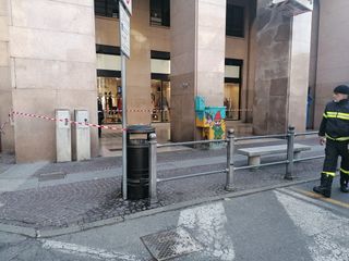 Alcuni cittadini hanno segnalato questa mattina, poco dopo mezzogiorno, il distacco dell'intonaco da alcune lastre di marmo che ricoprono l'edificio ad angolo con corso Aldo Moro e che si affaccia su piazza Monte Grappa.