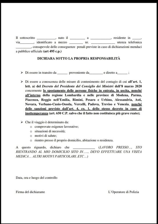 Il modulo potrà essere compilato anche al momento dell'eventuale controllo e verrà fornito dalle forze di polizia.