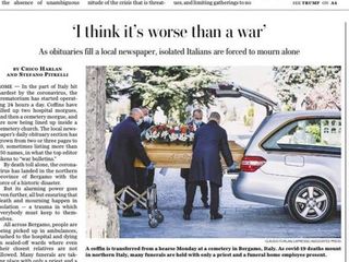 Lo sguardo che si posa su Bergamo viene da lontano. «Worse than a war», peggio di una guerra. Fa impressione il dramma di questa terra, portato sulla prima pagina del Washington Post con una foto di addio, quell’addio che neanche si può pronunciare davvero in questi tempi di Coronavirus.