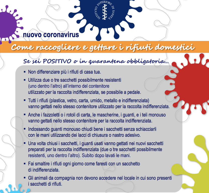 Vi allego due interessanti grafiche che mi giungono dall'Istituto Superiore di Sanità e che possono aiutare tutti noi, quando buttiamo i nostri rifiuti, a non mettere in difficoltà tutti i lavoratori che li devono raccogliere. Anche a loro, come a tutte le categorie di lavoratori e professionisti che in questi giorni difficili non possono e non vogliono tirarsi indietro dal fare il proprio dovere nell'interesse superiore della comunità, deve andare la nostra stima, la nostra riconoscenza e ogni cura che noi possiamo mettere, affinché corrano meno rischi possibili.