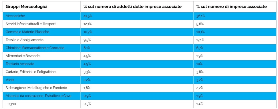 Le imprese associate all’Unione Industriali sono circa 1.100 per un totale di 64 mila addetti. La quasi totalità delle aziende ricade nella definizione di Pmi, per questo motivo il Comitato Piccola Industria di Univa (che rappresenta le imprese con meno di 100 addetti) è l'espressione più fedele dell'imprenditoria locale con una quota del 91% della base associativa. Basti pensare che il 78% delle imprese ha meno di 50 addetti; le imprese con più di 250 addetti sono il 3%. A livello di singoli Gruppo merceologici il più rappresentativo è quello delle produzioni “Meccaniche” che da sole si ritagliano una quota del 40,1% degli addetti impiegati dalle imprese associate Univa. Seguono i “Servizi Infrastrutturali e Trasporti” (12,1%), “Gomme e Materie Plastiche (10,7%) e il “Tessile e Abbigliamento” (9,5%). Sempre più importante è anche il “Terziario Avanzato” con una quota del 4,9% degli addetti, ma che da solo rappresenta il 10% delle imprese associate. Ma la forza dell’industria varesina rimane la multi-settorialità con una presenza chiave, non solo in termini numerici, ma anche di nomi di pregio e prestigio a livello internazionale, in ogni comparto.