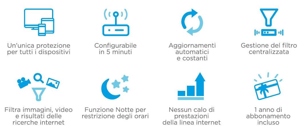 Si tratta di un router che blocca l’accesso ai contenuti Web inadatti ai bambini, compresi immagini, video e risultati di ricerche Internet. È un dispositivo che si collega in modo semplicissimo al router di casa del vostro fornitore Internet, quindi creerà una nuova rete Wi-Fi a cui faremo collegare i dispositivi dei nostri figli che navigheranno già da subito in modo sicuro. Non ci sarà bisogno di installare alcun software o App né sul computer, né su alcun dispositivo.