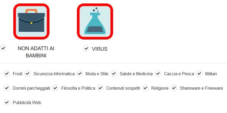 La categoria “Non Adatto ai bambini”, ad esempio, contiene le sottocategorie “Frodi”, “Militari”, “Pubblicità” ed altre che possono essere ognuna selezionata oppure no. Nella foto che segue vediamo tutte le sottocategorie di “Non adatto ai bambini”.