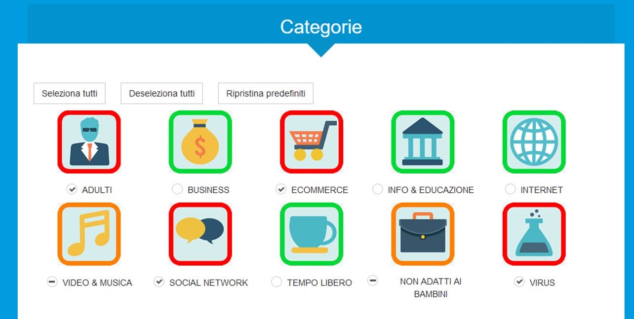 Appena acceso il dispositivo garantirà già una ottima protezione grazie alle categorie preimpostate non servirà fare null’altro. Ma i genitori potranno modificare le categorie di siti da bloccare in base all’età del bambino ed alle scelte educative andando nel pannello di controllo con le credenziali create durante la prima attivazione. Nell’immagine che segue vediamo le 10 categorie presenti dove quelle con il bordo in rosso sono quelle in cui tutte le sottocategorie sono bloccate, mentre in verde quelle dove nessuna sottocategoria è stata bloccata. Nel caso, invece, di una categoria che abbia alcune sottocategorie bloccate ed altre no l’icona è visualizzata con il bordo arancione.