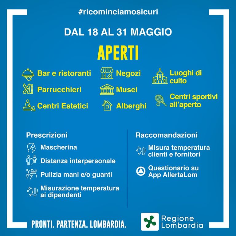 L'annuncio della Regione, che riapre dunque anche i negozi, arriva poco dopo la conferenza stampa in cui il premier Conte conferma la libertà di muoversi senza autocertificazione da lunedì sul territorio regionale e dal 3 giugno anche fuori se i dati del contagio lo permetteranno, mantiene il divieto di formare assembramenti, dà il via libera sempre da lunedì anche agli allenamenti degli sport di squadra e prevede la riapertura di centri estivi, cinema, teatri e spettacoli per il 15 giugno.