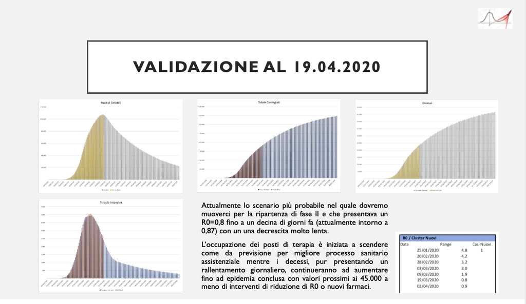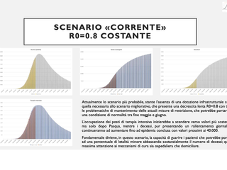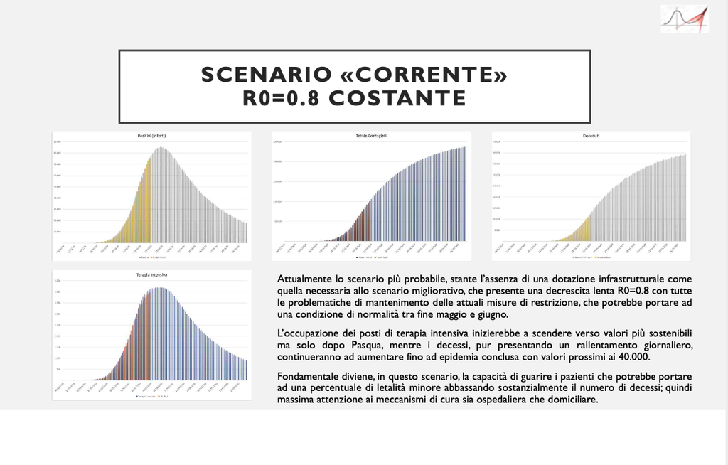 Questo ci permette di arrivare alle 10 linee di intervento in cui sono state individuate le infrastrutture strategiche: industriale, economico finanziaria, ospedaliera assistenziale, giuridico normativa, logistica, scolastica, famiglia individuo, università ed enti di ricerca, di competenza, tecnologica. 3 invece sono gli scenari possibili: corrente (R0 viene mantenuto ad un valore 0.8 attraverso la permanenza delle misure correnti; migliorativo (R0 viene fatto scendere ad un valore sotto a 0.5 auspicabilmente 0.4 tipo Corea del SUD); peggiorativo (R0 torna ad un valore pre-misure restrittive del 12 ed addirittura abbiamo un effetto di ‘rimbalzo’ dato dal desiderio di ‘tornare ad una vita normale’).