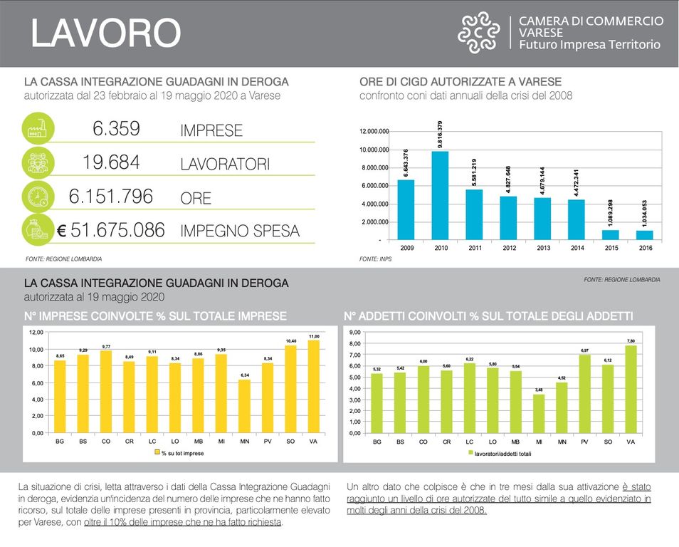 Secondo un'indagine condotta dall'Ufficio Studi e Statistica della Camera di Commercio di Varese, dal 23 febbraio al 19 maggio si è registrata un'impennata della Cassa Integrazione in Deroga: le ore richieste da 6.359 imprese hanno raggiunto quota 6.151.796. Un dato relativo a 19.684 lavoratori coinvolti che colpisce nella sua incidenza: nell’arco di poco meno di tre mesi, è stato raggiunto un livello di ore autorizzate del tutto simile a quello della totalità di molti degli anni seguenti alla crisi finanziaria del 2008.