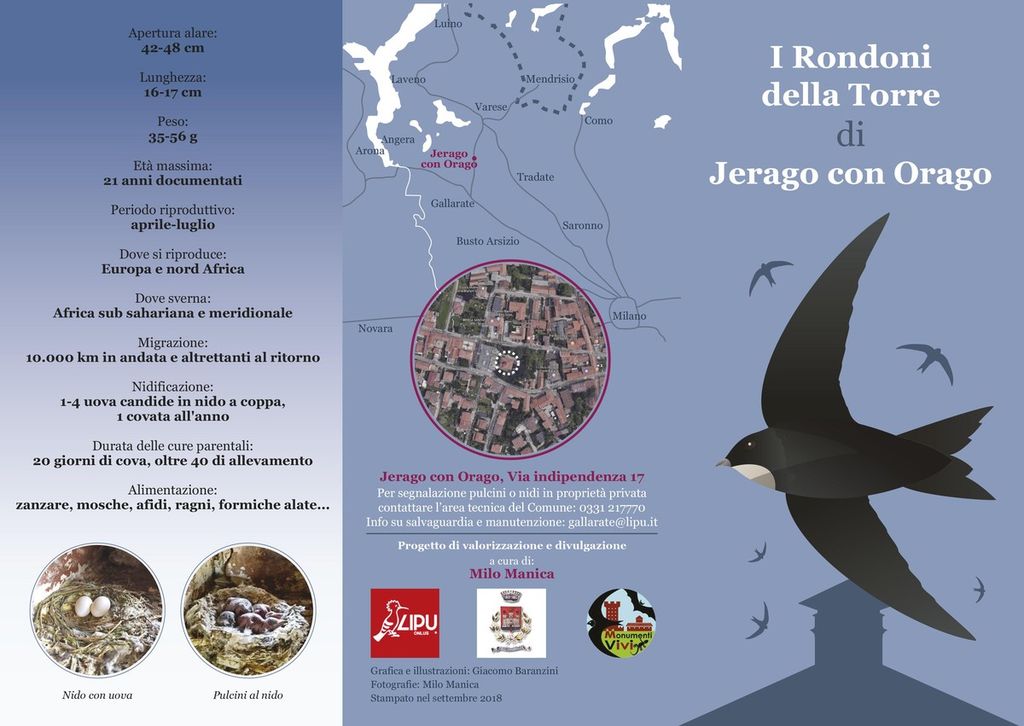 L’obiettivo di questa iniziativa, coordinata dalla Lipu con le due delegazioni di Varese e Gallarate, e con l’indispensabile collaborazione del Comune di Jerago con Orago, è quello di tenere alta l’attenzione su rondoni, sensibilizzando amministrazioni comunali e cittadini sull’importanza di conoscere e tutelare questa specie che, in declino numerico, da secoli vive e nidifica nei manufatti urbani delle nostre città. Il progetto nasce in continuità con l’adesione del Comune di Jerago con Orago alla “Delibera Salvarondini” della Lipu, il provvedimento amministrativo che vieta la distruzione dei nidi di rondine, rondone e balestruccio durante il periodo riproduttivo.