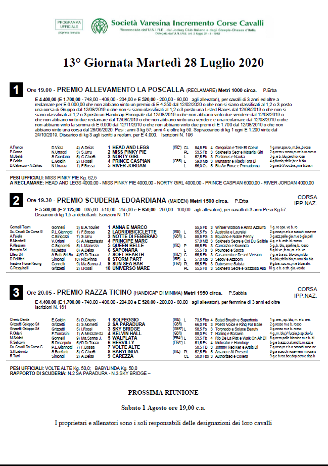 Si chiude alle 21.40 con una reclamare per gentleman riders e amazzoni dove non c’è un favorito plebiscitario e allora ci affidiamo al positivo Mr Business, da 4/1 in su, oppure proviamo con Graziotto o Inaspect.