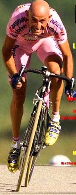 Ci è voluto un po' ma alla fine la tenacia di Martino ha prodotto il risultato che vedete anche in fotografia e cioè un magnifico tatuaggio sul polpaccio sinistro, con l'effigie, i colori e il ghigno del Pirata mentre si alza sui pedali per una delle sue imprese più belle. La foto originale che ha ispirato il tatuaggio, e che vedete qui in basso, è infatti quella del Giro 1999, quando Marco arrivò come un fulmine rosa all'Alpe di Pampeago.