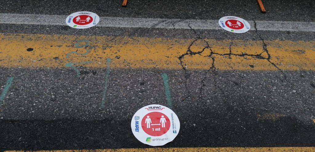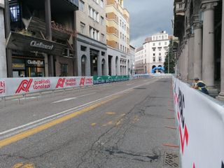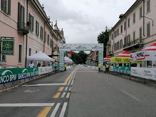Corridori a Saronno, media alta: significa che entreranno nel circuito di Varese per la prima volta alle 15. Ecco come sono stati posizionati i tifosi sul traguardo, dove sta iniziando a piovere: nella foto di Alesssandro Galbiati si vedono i bollini rossi dove si devono posizionare gli appassionati, distanti un metro l'uno dall'altro.