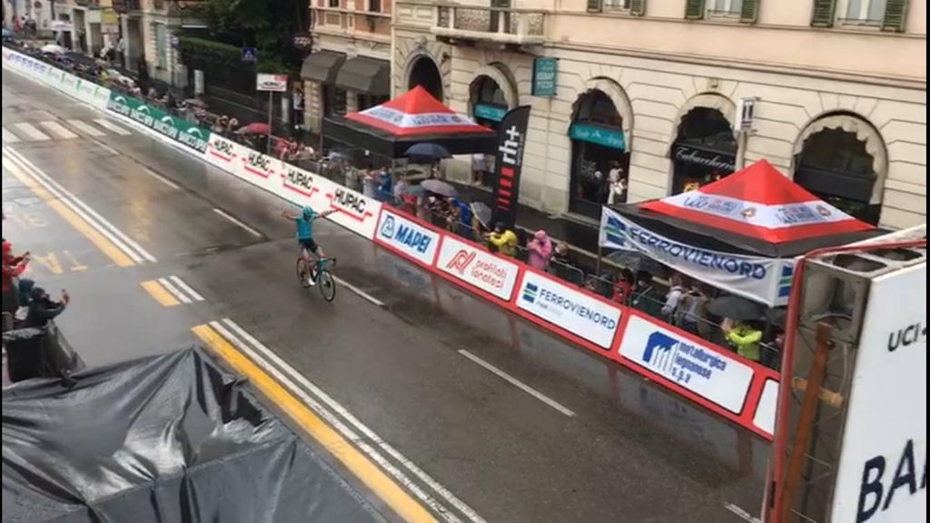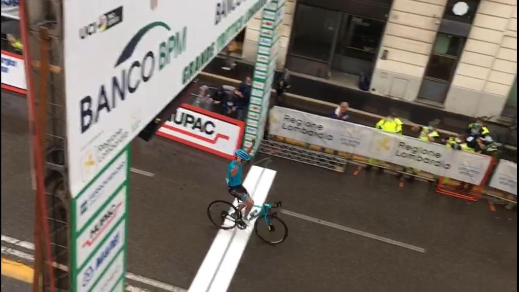 Taglia il traguardo in solitaria Gorka Izagirre. Il basco dell'Astana firma la vittoria di un'edizione emozionante del Grande Trittico Lombardo, sotto il nubifragio. Braccia al cielo di Varese. Ecco l'arrivo in via Sacco: