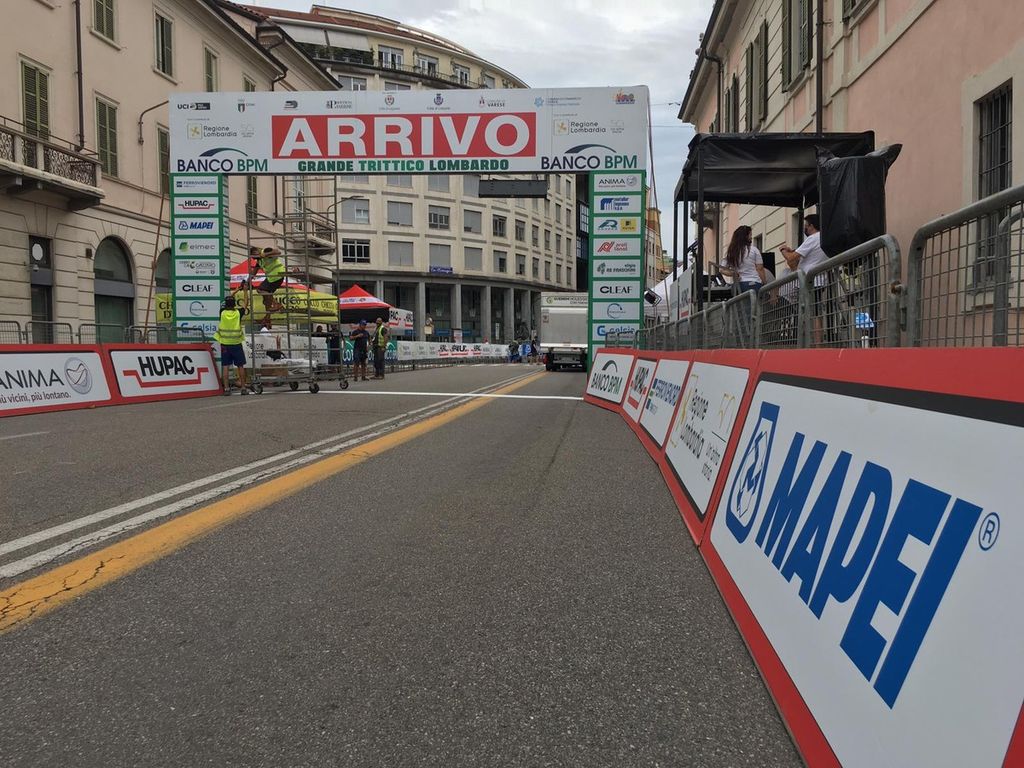 In via Sacco si attendono i corridori: diminuisce il vantaggio del gruppetto in fuga, di poco superiore agli otto minuti. Primi tuoni dal cielo. Sul traguardo è presente anche Paolo Nozza, presidente di Ferrovie Nord che ha aiutato il Grande Trittico «per la volontà ferrea degli organizzatori per portare avanti un evento sportivo che, in questo contesto, è una dimostrazione di vero coraggio e di fare sintesi tra territori».