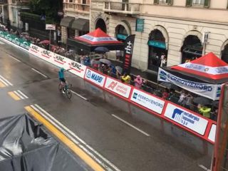 Piove forte sul circuito cittadino di Varese. Un vero e proprio nubifragio che rallenta l'andatura dei corridori. Il gruppo attraversa ora via Sacco sotto una pioggia fittissima.