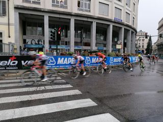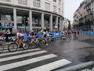 Secondo passaggio in via Sacco dei cinque corridori del gruppetto in fuga. Altri tre giri all'arrivo. A 4 minuti e 25 secondi da loro il gruppo degli inseguitori, mentre continua a piovere con una certa intensità. A questo ritmo i cinque corridori in testa potrebbero essere irraggiungibili, a meno di un cambio di passo.