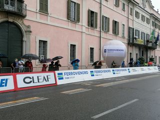 Ombrelli aperti sul traguardo: a Varese ha iniziato a piovere, si è alzato anche il vento e si sentono numerosi tuoni. Continua a scendere il vantaggio dei cinque in fuga a pochi minuti dall'entrata dei corridori nel capoluogo.