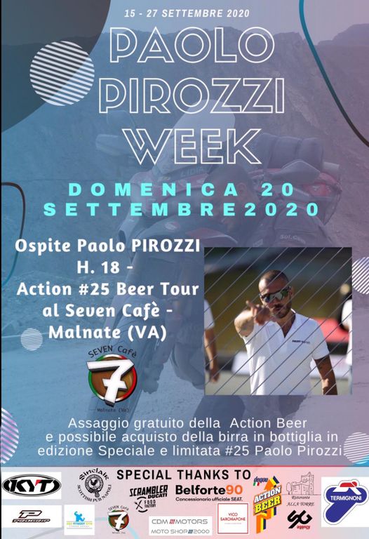 Paolo Pirozzi sarà ospite al “Seven Cafè” di viale delle Vittorie 38 a Malnate, alle 18 di domenica, dopo essere partito per la sua “Paolo Pirozzi Week” in sella alla sua inseparabile Ducati Panigale, organizzato dai suoi manager di SG-Agency, proprio in onore dei sui 10 anni dal giro del mondo in 80 Ducati club ufficiali sparsi in tutto il pianeta.